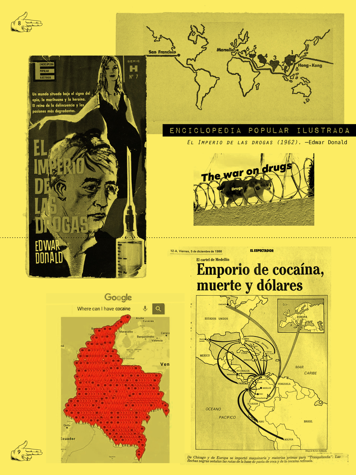 Página amarilla del libro Narcolombia, Líneas de investigación y creación sobre estética y narcotráfico en Colombia curado por estudiantes de Arte Andrea Infante y Paula R. Leuro.