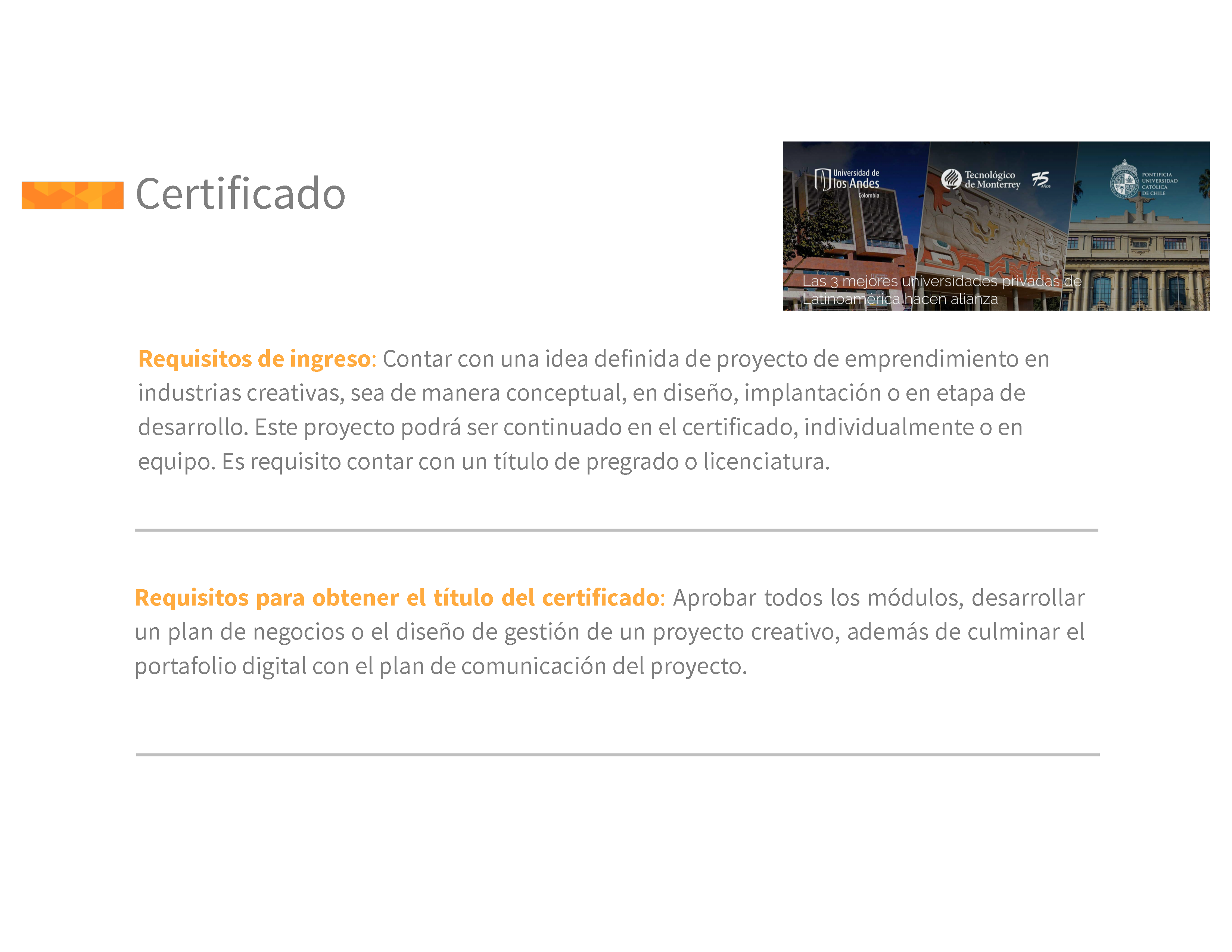 Certificado Emprendimiento en las Industrias Creativas – Universidad de los Andes, Tecnológico de Monterrey, Universidad Católica de Chile