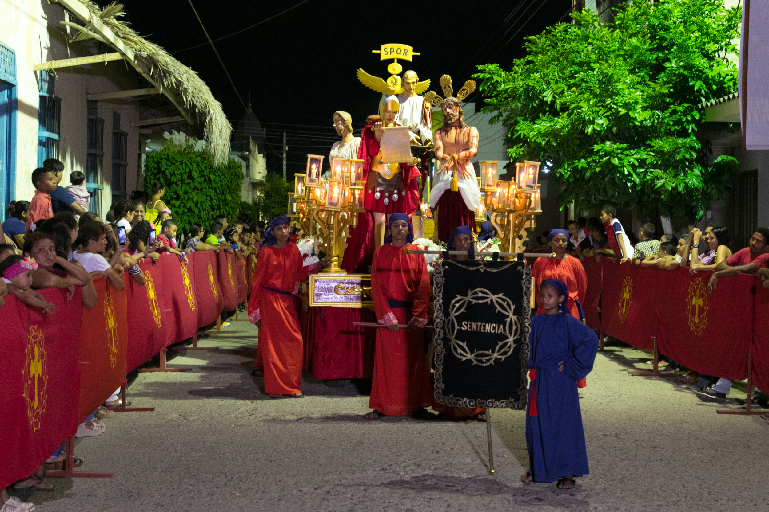 Es un conjunto de seis esculturas que representa los siguientes personajes: Jesús de pie amarrado de manos cruzadas adelante con laceraciones por todo el cuerpo emanando sangre, presenta un lazo amarrado alrededor del cuello, ataviado con túnica blanca en la cintura y manto rojo, taller Guillermo Vega Acabado Silvio Burgos D. Delante de Jesús, un soldado romano lee un pergamino que sostiene con sus manos al frente, viste túnica roja, cíngulo negro, manto rojo, casco dorado, protector de piernas y calza sandalias café. Sobre una tarima está Pilatos atrás de Jesús en actitud de lavar sus manos en un platón que es sostenido por un niño esclavo. Viste túnica blanca, cíngulo dorado y manto rojo. El niño esclavo es de tez negra, con indumentaria de faldellín café oscuro y cinturón de color crema. El cuarto personaje representa a Claudia Prócula, sentada a la derecha de Pilatos y vestida de túnica verde claro y una diadema de la cual descuelga hacia atrás un largo velo de color verde. El último personaje representa a Barrabás de pie dando la espalda a Jesús con los brazos cruzados atrás. Viste túnica de color crema amarrada a la cintura con cinturón café claro.