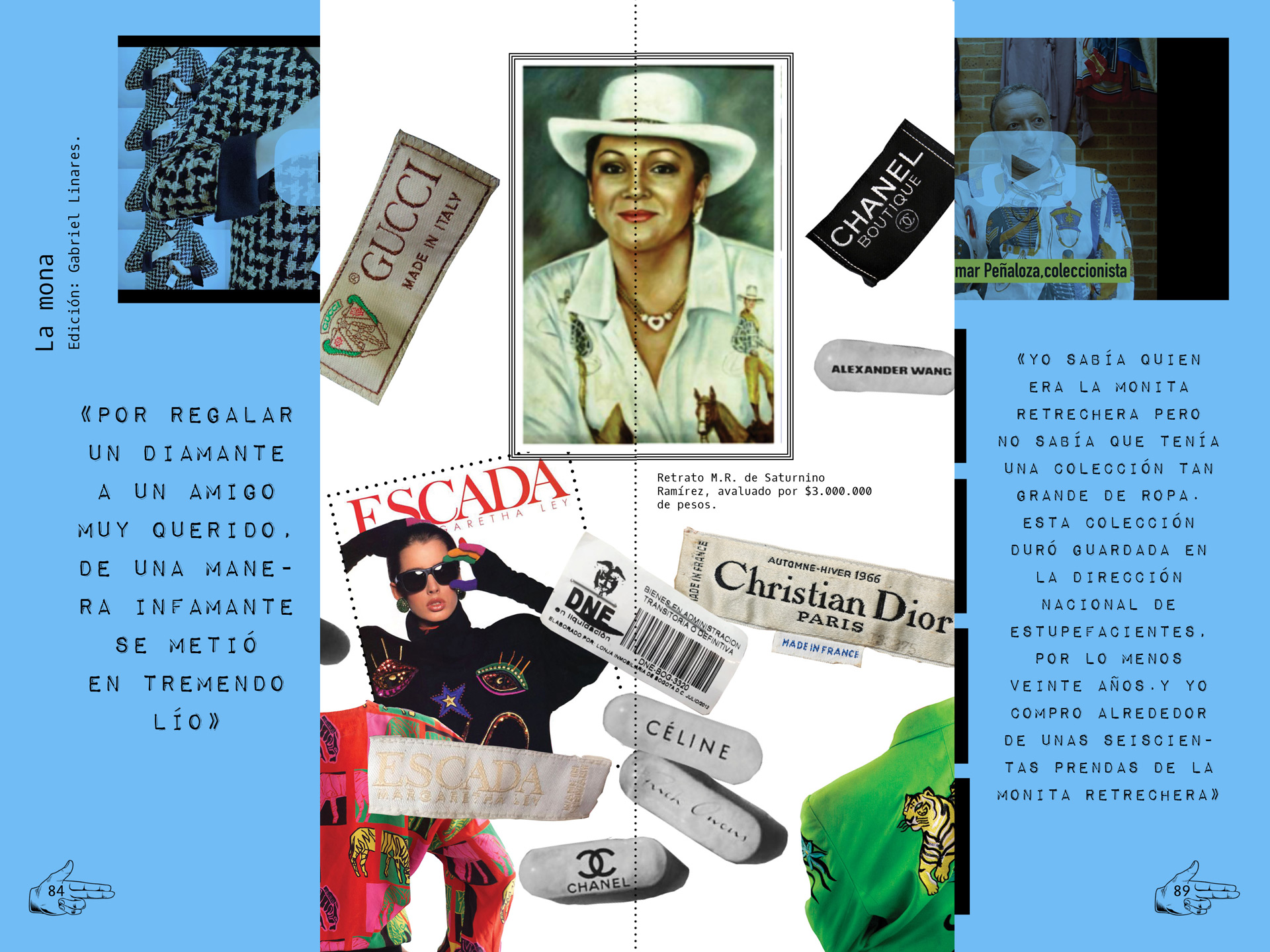 Parte del folleto con el closet de la Monita retrechera en la mitad del libro Narcolombia, Líneas de investigación y creación sobre estética y narcotráfico en Colombia curado por estudiantes de Arte Andrea Infante y Paula R. Leuro.
