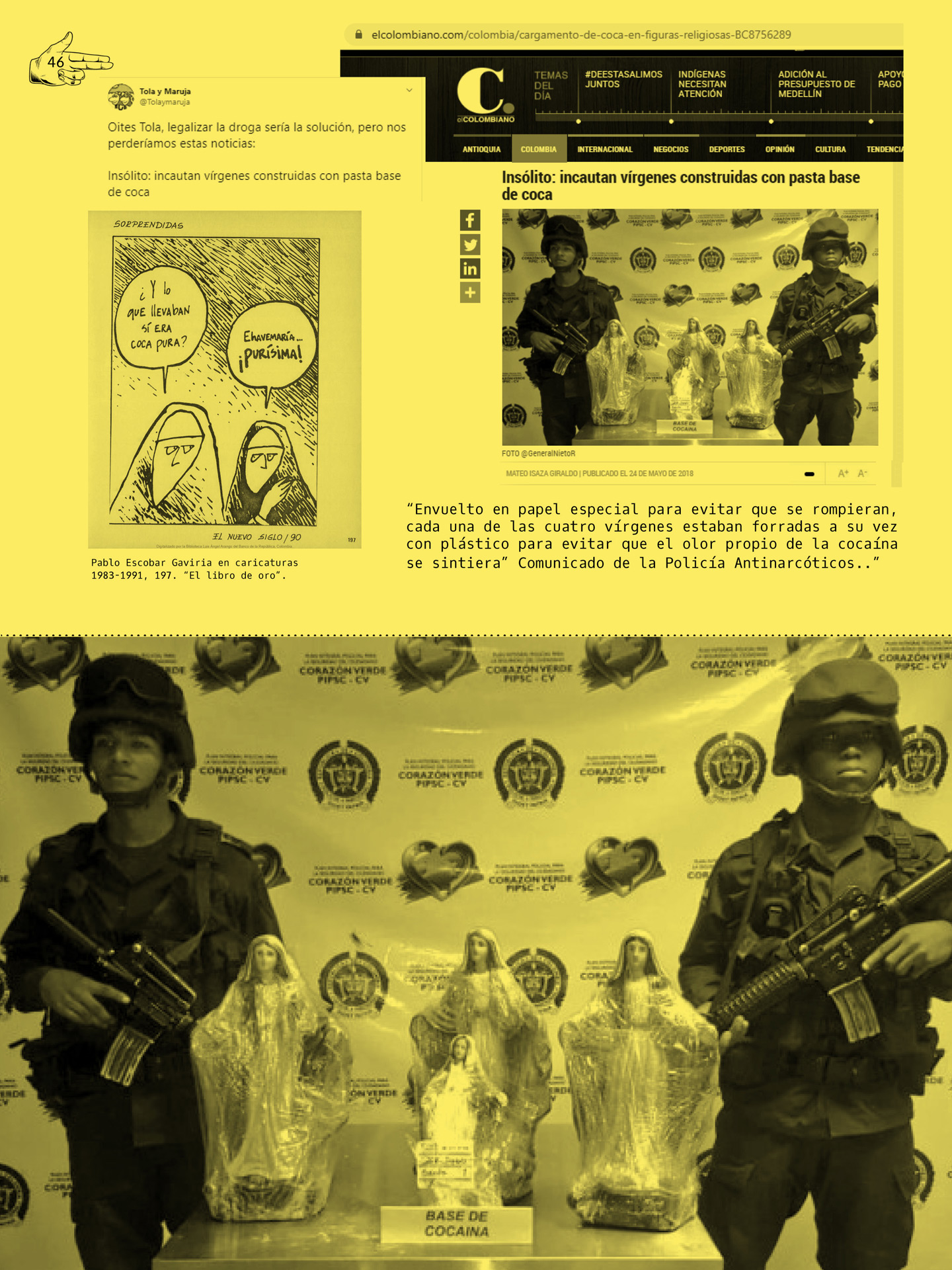 Página del libro Narcolombia, Líneas de investigación y creación sobre estética y narcotráfico en Colombia curado por estudiantes de Arte Andrea Infante y Paula R. Leuro. Caricatura sobre cocaína y captura de pantalla del periódico El Colombiano sobre la policía.