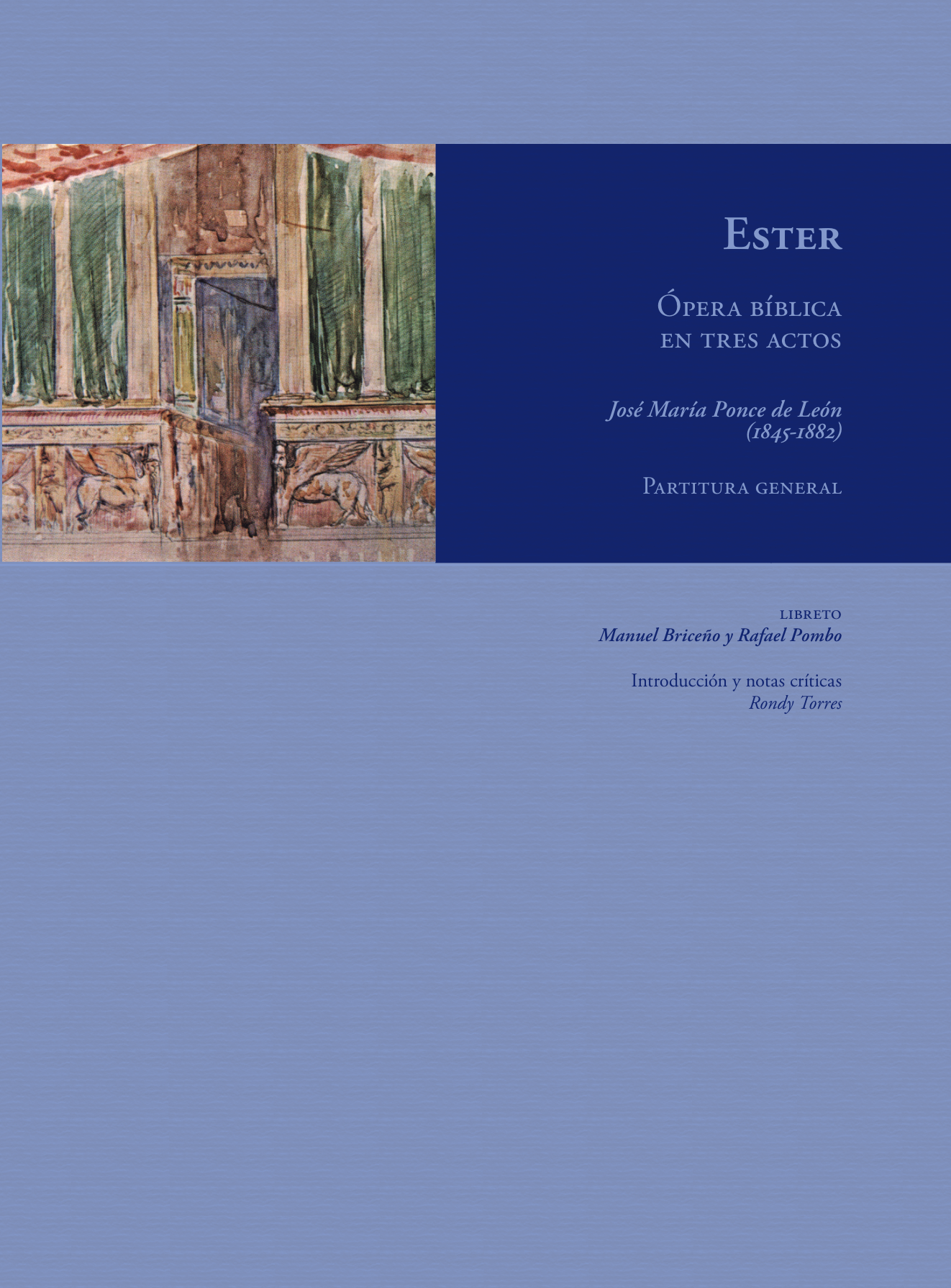 Durante la segunda mitad del siglo XIX, diferentes compañías viajeras europeas presentaron óperas y zarzuelas en Bogotá. José María Ponce de León (1845-1882), compositor bogotano, escribió tres grandes obras líricas: dos óperas sobre libretos del poeta Rafael Pombo, Ester (1874) y Florinda (1880), y la zarzuela El castillo misterioso (1876). Considerada como la primera ópera escrita por un compositor colombiano, Ester, ópera bíblica en tres actos fue estrenada en 1874 en el Coliseo Maldonado de Bogotá por una compañía italiana. Desde entonces, y pese a la revisión de la obra por parte del compositor, la ópera nunca volvió a ser representada y cayó en el olvido. La presente edición crítica, basada en los manuscritos autógrafos conservados en diferentes archivos en Bogotá, es la primera edición integral de esta ópera colombiana. Esta publicación se hace junto con la reducción para canto y piano.