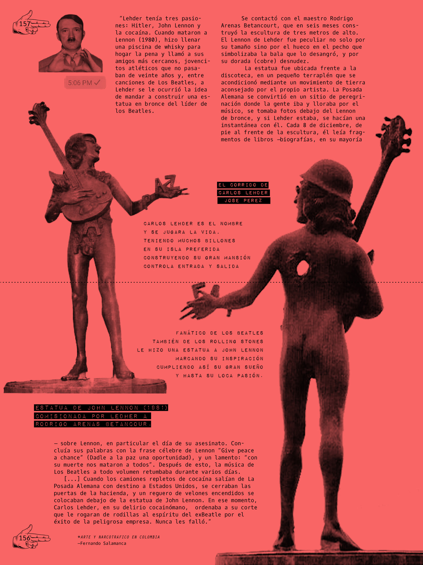 Página roja del libro Narcolombia, Líneas de investigación y creación sobre estética y narcotráfico en Colombia curado por estudiantes de Arte Andrea Infante y Paula R. Leuro.