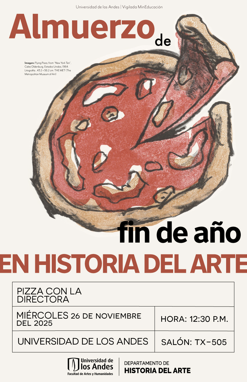 Miércoles 26 de noviembre | 12:30 p.m Participan: Juanita Solano Roa Directora del Departamento de Historia del Arte - Profesora asociada Inicia noviembre 26, 2025 - 12:30 pm Termina noviembre 26, 2025 - 2:00 pm Dirección Universidad de los Andes, salón TX-505 Ver mapa Categorías Encuentro Almuerzo de fin de año en Historia del arte Pizza con la directora + GOOGLE CALENDAR + ICAL IMPORT