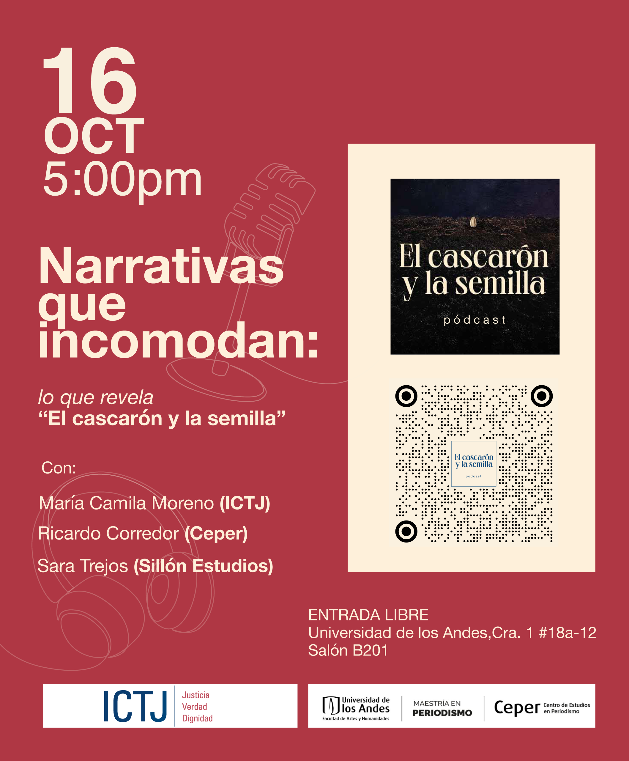 El próximo jueves 16 de octubre en Uniandes se presentan los hallazgos del documento “El cascarón y la semilla”, de Marta Ruiz y que fue convertido en una experiencia sonora de pódcast por el ICTJ y Sillón Estudios.