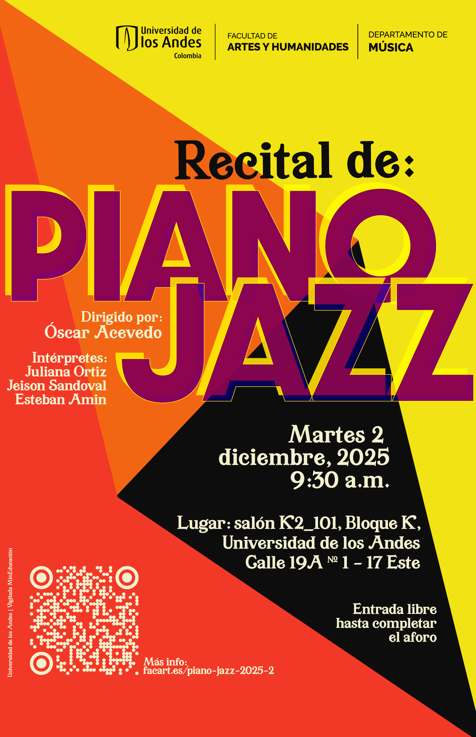 Martes 2 de diciembre de 2025 a las 7:00 p.m. en el salón K2_101, Universidad de los Andes Inicia diciembre 2, 2025 - 9:30 am Termina diciembre 2, 2025 - 11:00 am Dirección Salón K2_101, Bloque K, Universidad de los Andes (calle 19A # 1 – 17 Este) Ver mapa Categorías Concierto , Música , Recital Recital de Piano Jazz en 2025-2 Fecha: martes 2 de diciembre de 2025 Hora: 9:30 a.m. Lugar: salón K2_101, Bloque K, Universidad de los Andes (calle 19A # 1 – 17 Este) Evento de entrada libre hasta completar el aforo de la sala Dirigido por el maestro Óscar Acevedo. Intérpretes: Juliana Ortiz, Jeison Sandoval y Esteban Amin. Tags: 2025-2|Música Uniandes|piano jazz|Universidad de los Andes + GOOGLE CALENDAR + ICAL IMPORT