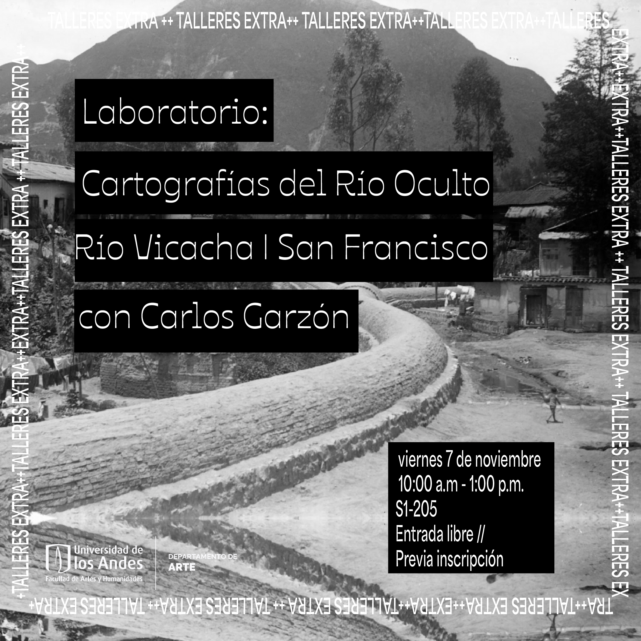 El río Vicachá o San Francisco ha sido uno de los cuerpos de agua vitales para Bogotá desde tiempos prehispánicos hasta la modernidad. Aunque hoy su cauce transita oculto bajo el suelo urbano, su presencia sigue viva en la memoria y el movimiento de la ciudad. Este laboratorio propone un recorrido por el barrio de Las Aguas para reconocer las huellas del río y, a partir de la técnica del monotipo, crear una cartografía colectiva que revele nuestras formas de observar, imaginar y habitar ese río que aún resplandece en la oscuridad.