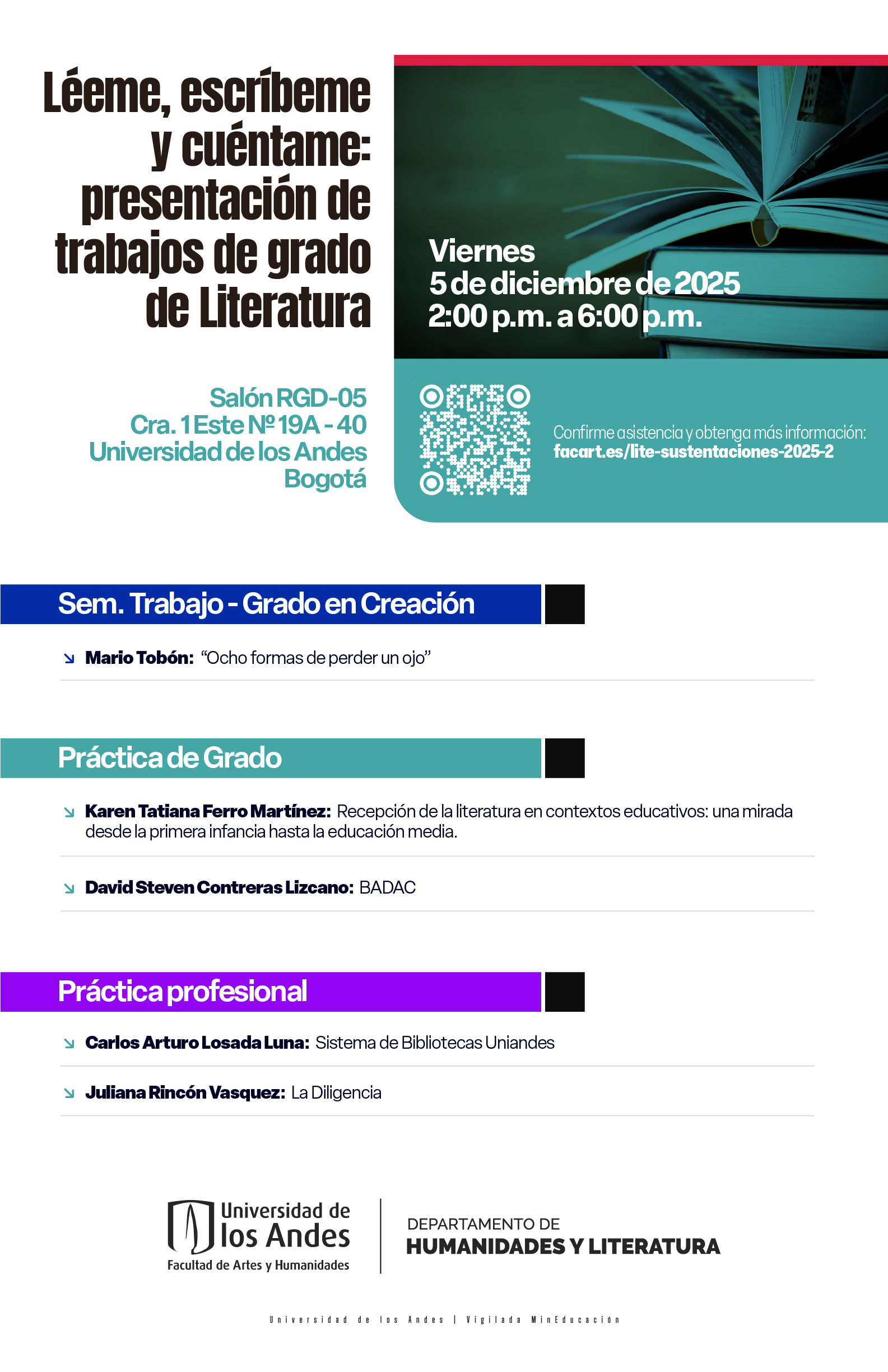 Los invitamos a incribirse a la presentación de trabajos de grado de Literatura del segundo semestre de 2025. Léeme, escribeme y cuéntame.
