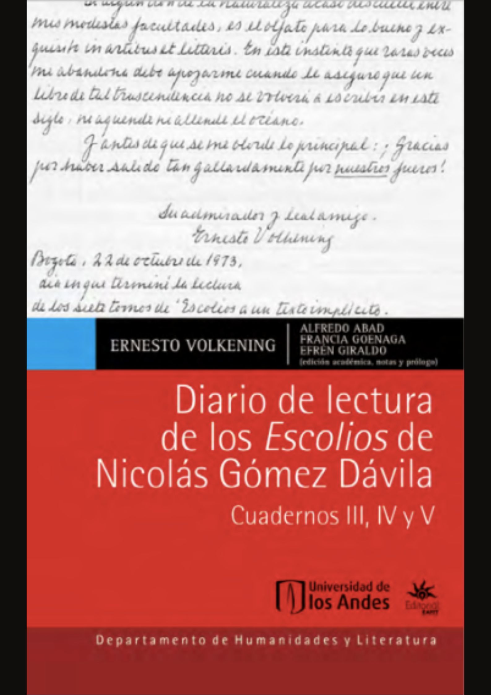 En mayo de 1973, Ernesto Volkening recibió de Nicolás Gómez Dávila un legajo con los textos inéditos que fueron publicados cuatro años después con el título Escolios a un texto implícito. “Inicio la lectura de los Escolios hoy, el día 24 de mayo de 1973 —escribió Volkening—. Y a un tiempo empiezo a tomar los apuntes con los cuales me propongo llenar este cuaderno, y tal vez otros.” A los pocos meses Volkening le presentó a Gómez Dávila los cinco cuadernos en que transcribió y comentó los escolios que despertaron con más fuerza su interés. La presente edición, que consta de dos volúmenes, recoge el texto íntegro de los cinco cuadernos, respetando la disposición del original, e incluye una comparación exhaustiva de los escolios transcritos en los cuadernos con los que se publicaron posteriormente en la primera edición de Colcultura (1977). Puesto que varios de los escolios que Volkening transcribió son inéditos o presentan divergencias importantes con respecto a los que luego pasaron a imprenta, estos cuadernos no solo revelan el agudo intelectual que fue Ernesto Volkening sino que son una ventana privilegiada al taller de escritura del maestro aforista Nicolás Gómez Dávila.