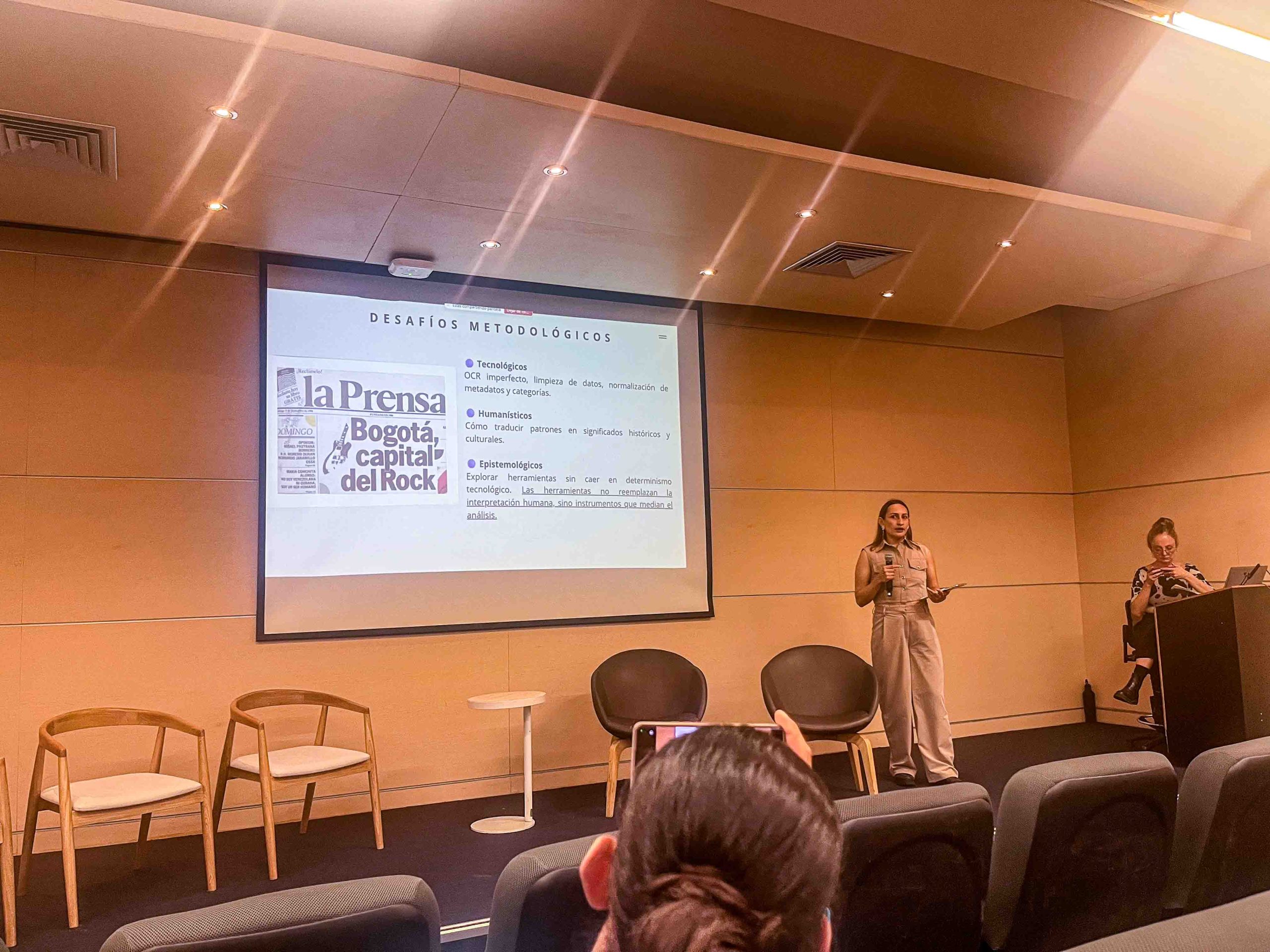 - Análisis de texto y procesamiento de lenguaje natural: Jennifer Mendosa y Sara Colmenares, estudiantes actuales, presentaron investigaciones que exploran cómo los algoritmos permiten lecturas distantes de grandes corpus textuales. Jennifer trabaja con entrevistas de la Comisión de la Verdad para analizar sentimientos, cuestionando los límites y sesgos de los lexicones que alimentan los modelos. Sara, por su parte, estudia archivos de prensa para identificar patrones y temáticas invisibles a la lectura cercana, aprovechando el poder computacional para abrir nuevas preguntas históricas y culturales.
